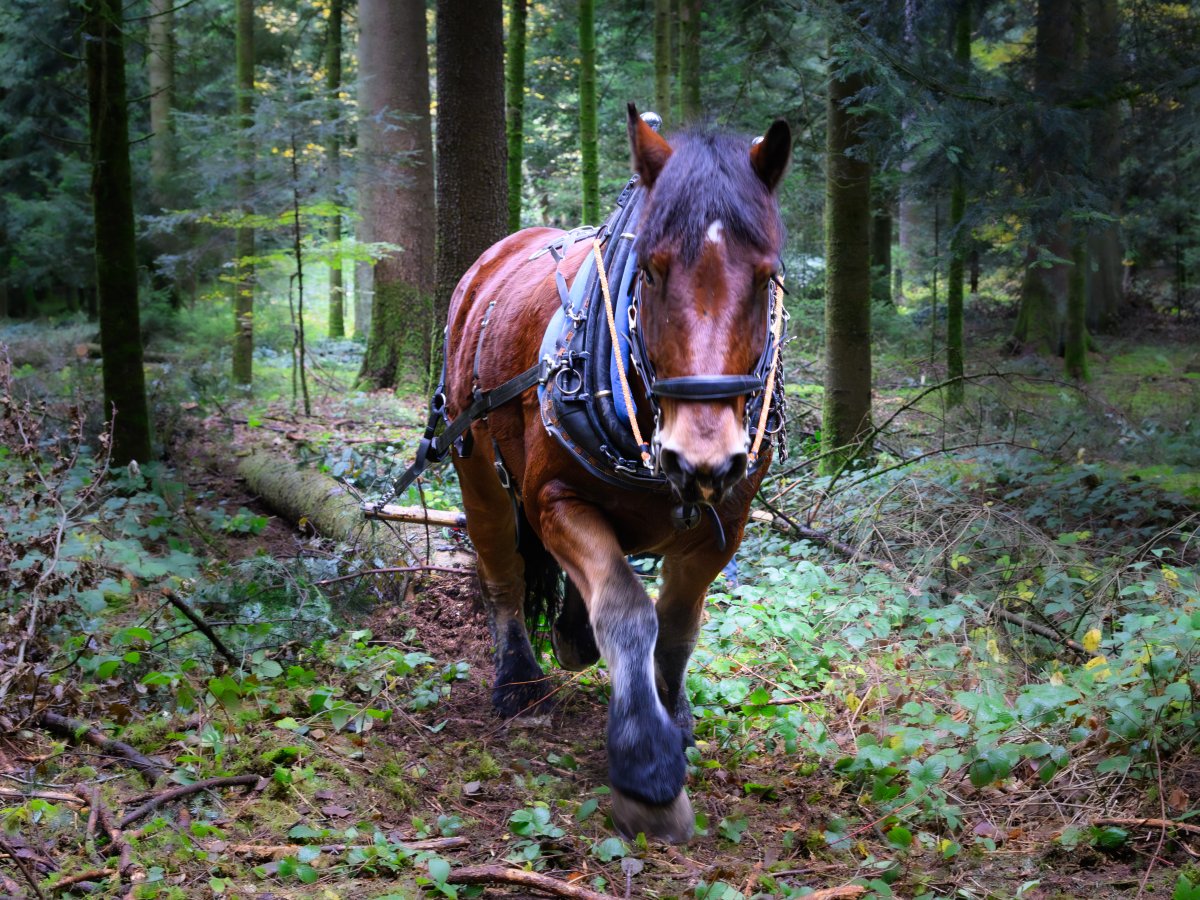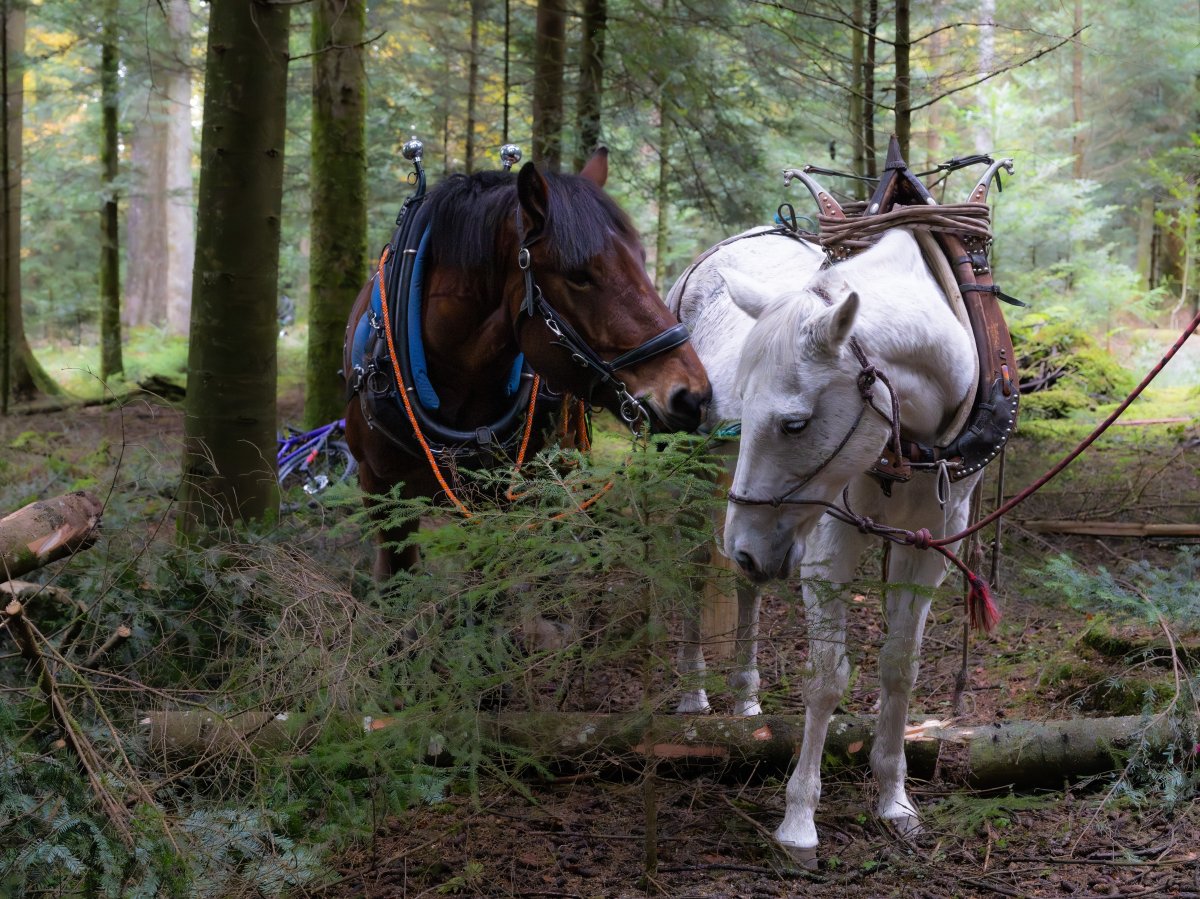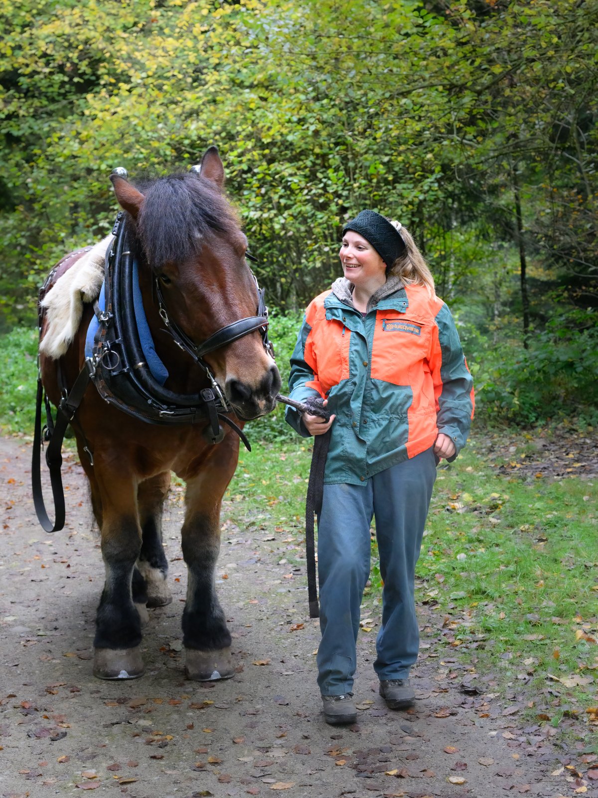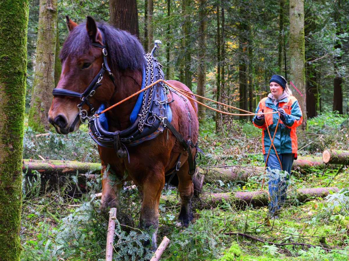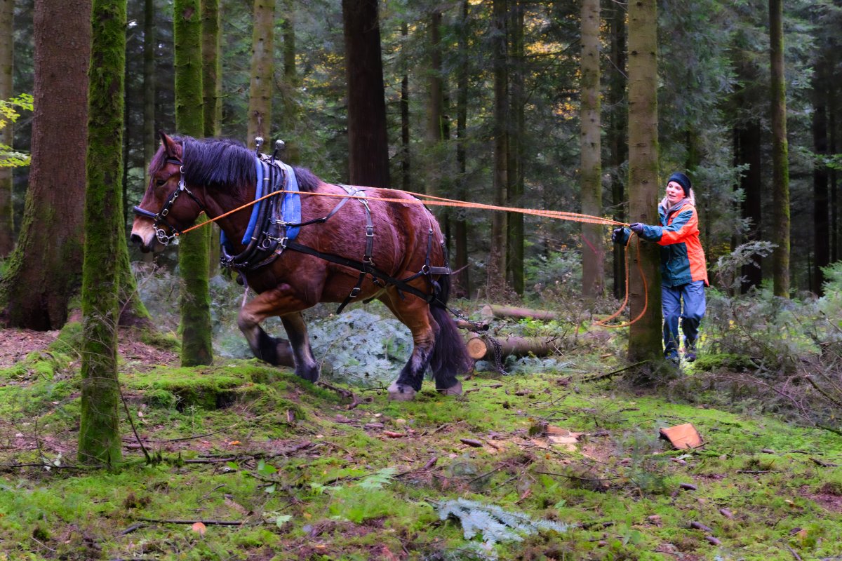 Mit einer langen Leine und zusätzlichen Kommandowörtern lenkt Katleen Harry sorgfältig aus dem Dickicht. Dabei werden immer wieder die gleichen Pfade benutzt, um den Waldboden nicht zu beschädigen. Diese Art des Holzrückens ist sehr waldschonend. Der Boden wird nicht verdichtet wie mit grossen Maschinen und gleichzeitig durch die geschleppten Stämme aufgeraut und vom Moos befreit. So können neue Pflanzen gut wachsen.