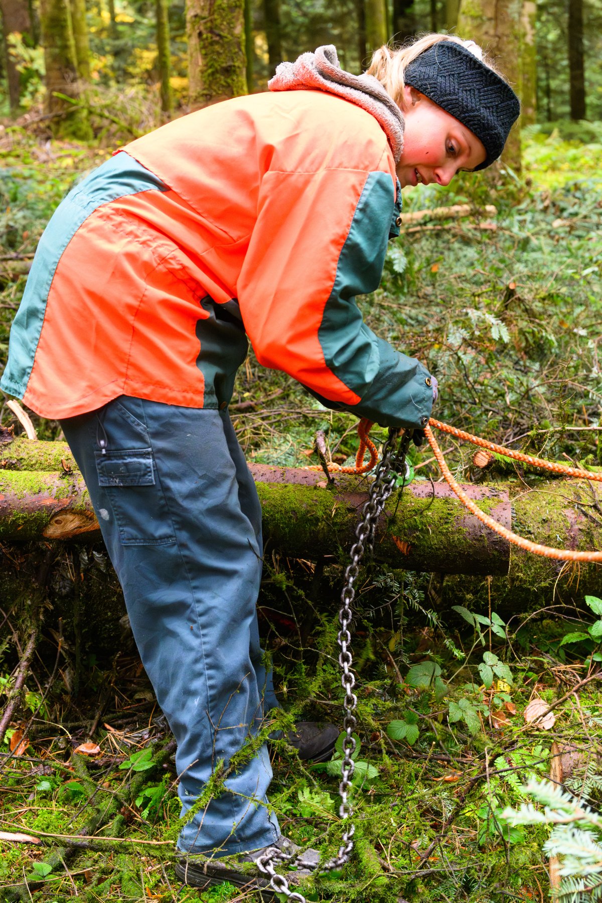 Nun wird aber angepackt. Im Wald liegen viele gefällte Bäume bereit und warten auf den Abtransport. Sobald Katleen Harry zum ausgesuchten Stamm navigiert hat, steht er ruhig, während sie mit Ketten den Stamm befestigt, der rausgezogen werden soll.