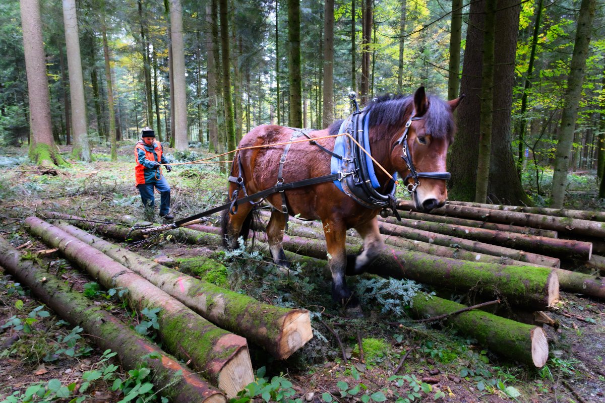 Für den späteren Abtransport müssen die Stämme sauber geordnet an der Waldstrasse deponiert werden. Dies ist eine Arbeit, die hohe Konzentration und viel Geschick von Frau und Pferd verlangt. Wie eindrücklich zu beobachten, wie dieses mächtige Kaltblut sich auf kleinem Raum bewegen kann und sich auch traut, über die Baumstämme zu gehen.
